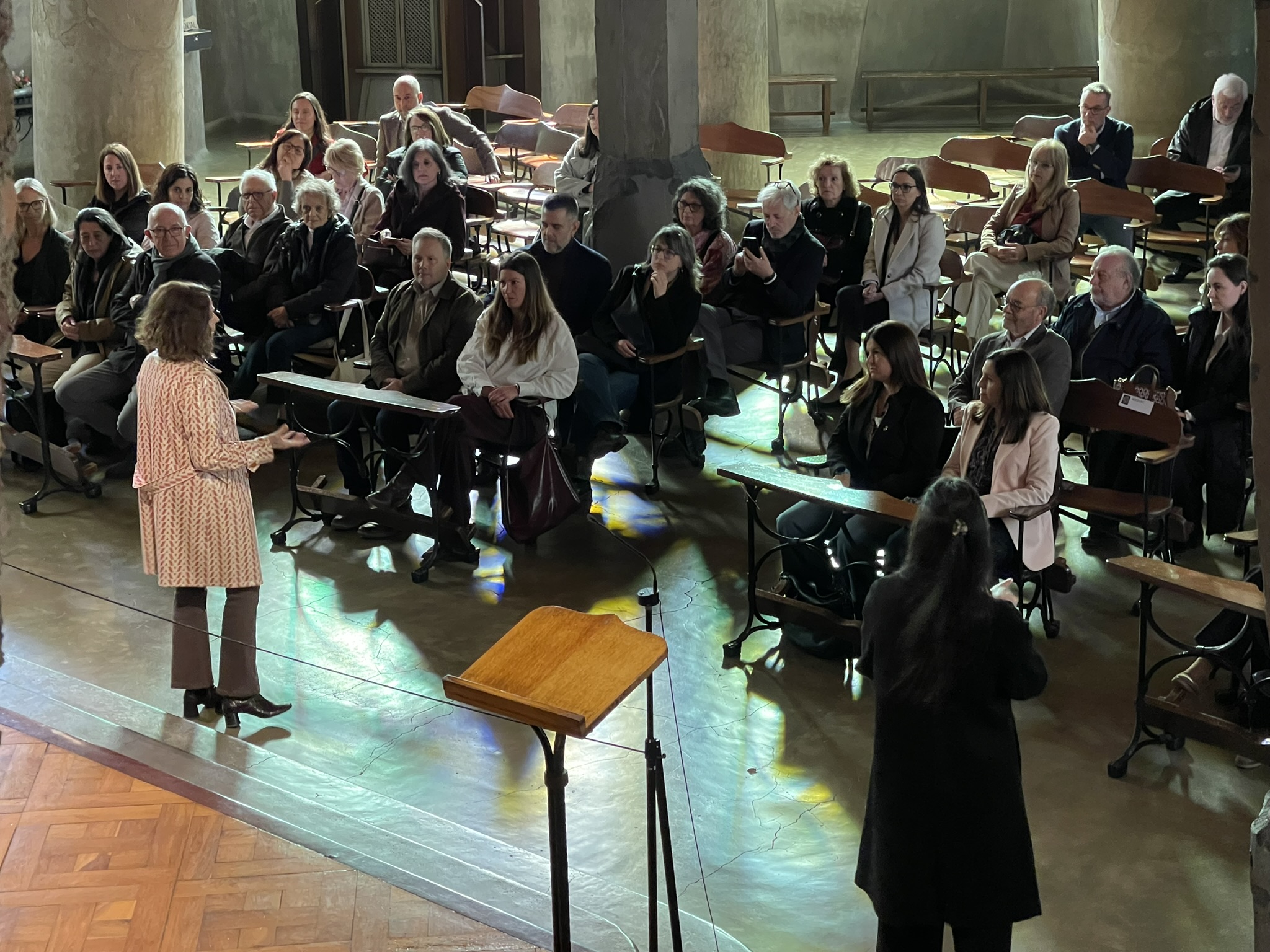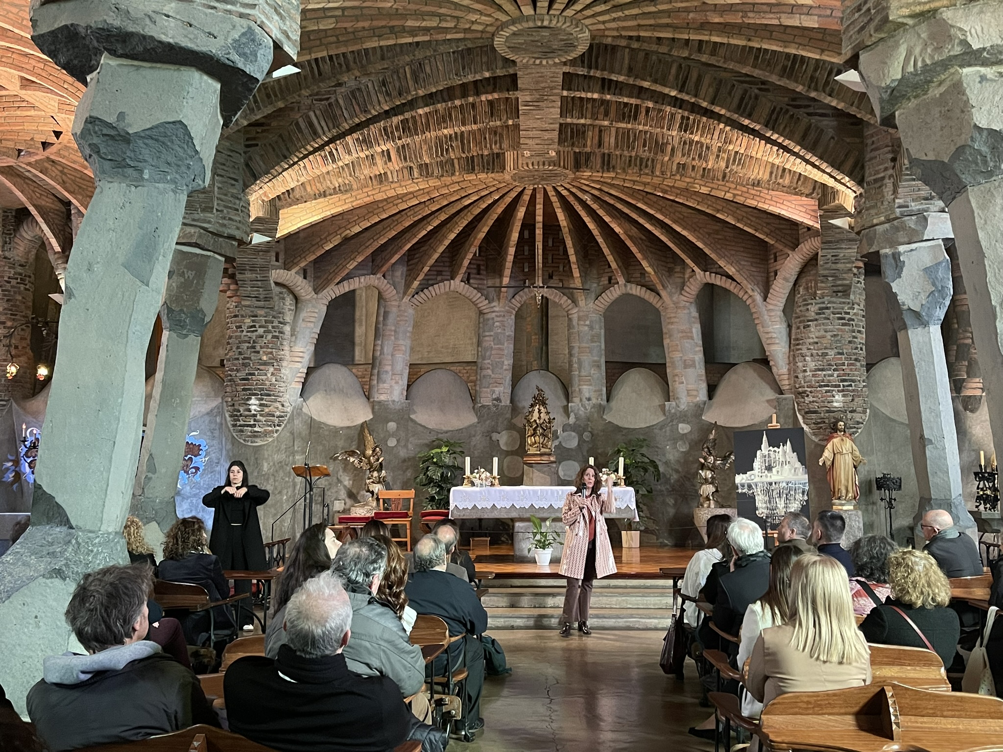 El matí s'ha iniciat amb una recepció oficial seguida d’una visita guiada a càrrec de la humanista Gemma Martí, experta en l'univers gaudinià. Les persones assistents han pogut recórrer l’interior de la Cripta i pujar al seu terrat, redescobrint elements pioners com la maqueta funicular, les estructures arborescents i els murs plegats, innovacions que Gaudí va assajar aquí i que han influït decisivament en l’arquitectura contemporània.